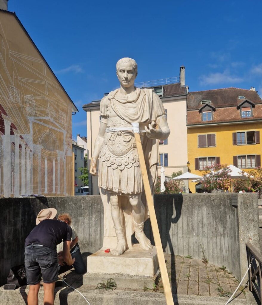 Fragilisée et déstabilisée, la statue de Jules César trônant au-dessus du Musée romain a souffert cet été. Elle sera retirée le mercredi 28 août pour une réparation complète en atelier, qui durera une à deux semaines.