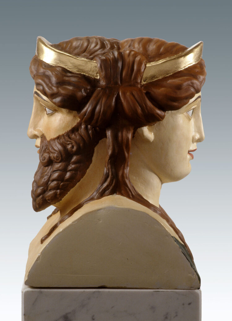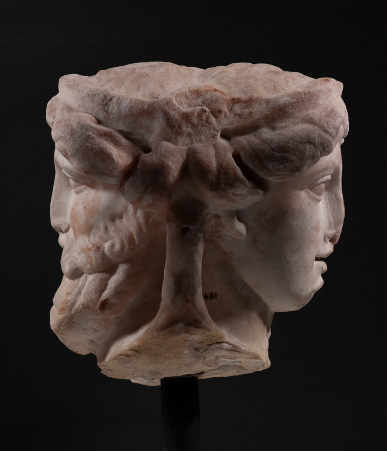 Double hermès représentant les têtes de Bacchus, dieu du vin, et de son épouse Ariane. Cette pièce, en marbre de Carrare, était à l’origine dressée sur un pilier. Il s’agit d’un exemple caractéristique de la sculpture qui ornait des jardins. Importée d’Italie centrale, elle se rattache à des modèles grecs de la fin du 4e siècle avant J.-C.