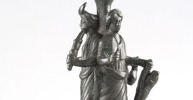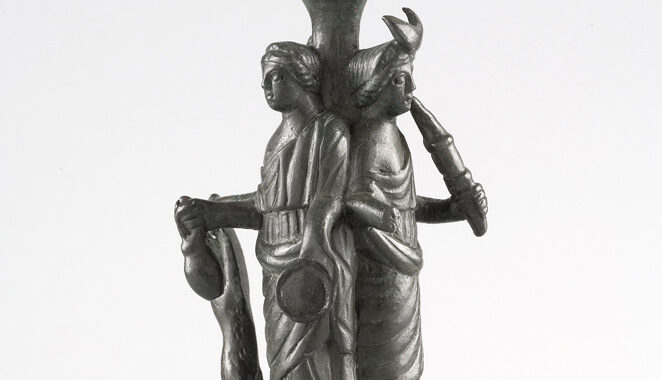 La déesse Hécate, originaire de Thrace, partie orientale des Balkans actuels, est très rare sous nos latitudes. Elle l’est d’autant plus sous cette forme à triple corps: trois femmes appuyées contre une colonne regardant chacune dans une direction différente. L’une s’apprête à sacrifier un chien, l’autre porte une cruche et une patère destinées aux libations, tandis que la dernière brandit une torche, une demi-lune ceinte sur son front. Autour d’elles, et sur le socle, sont représentés objets et animaux en lien avec son culte: serpent, tortue et lézard, fruits, pain et arbre identifié comme un pin… tous des symboles qui ont un lien avec la fécondité. Déesse liée aux Enfers, magicienne mystique, maîtresse des carrefours, l’Hécate dépeinte sur cette figurine semble symboliser une facette plus heureuse: celle de la fertilité et de l’abondance.